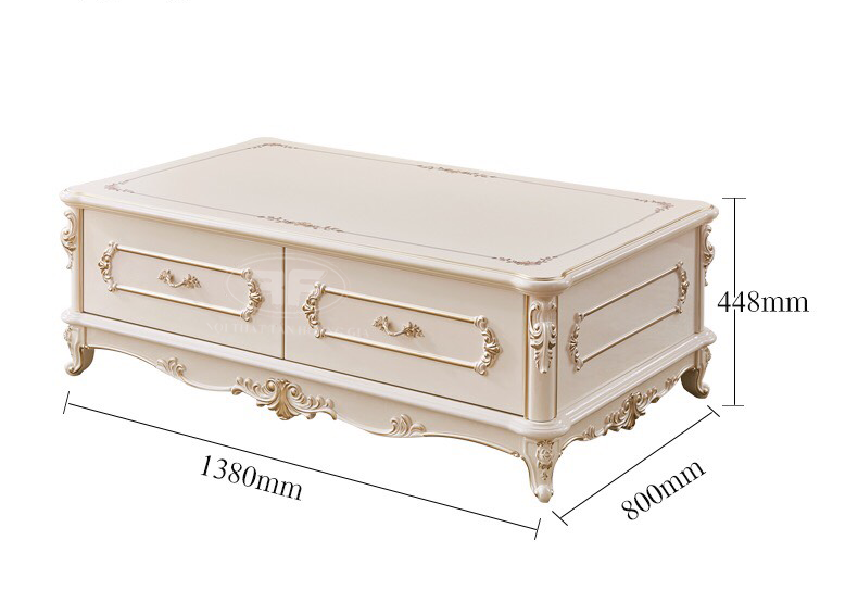- Kích thước bàn trà chữ nhật phòng khách lớn: 1300-1500 x 600-650 x460mm.